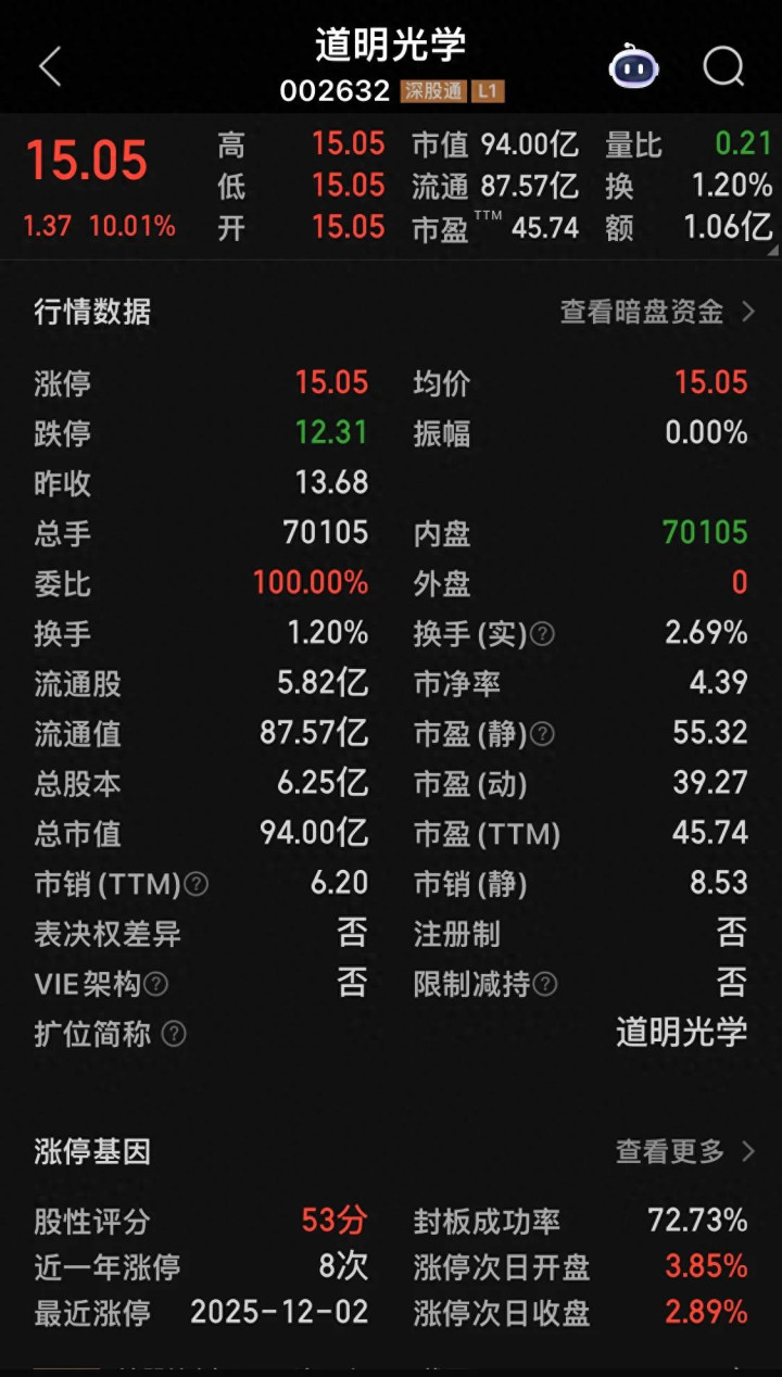 道明光学股票连拉两个涨停!12月1日和2日收盘涨幅偏离值累计超20%,直接被交易所列为异常波动。公司连夜发公告澄清:媒体讨论的“AI手机”热点和我们真没关系,目前根本没这业务。股价越涨越心虚啊,这波操作看得人直挠头——热点蹭得飞起,但钱烫手不敢接?