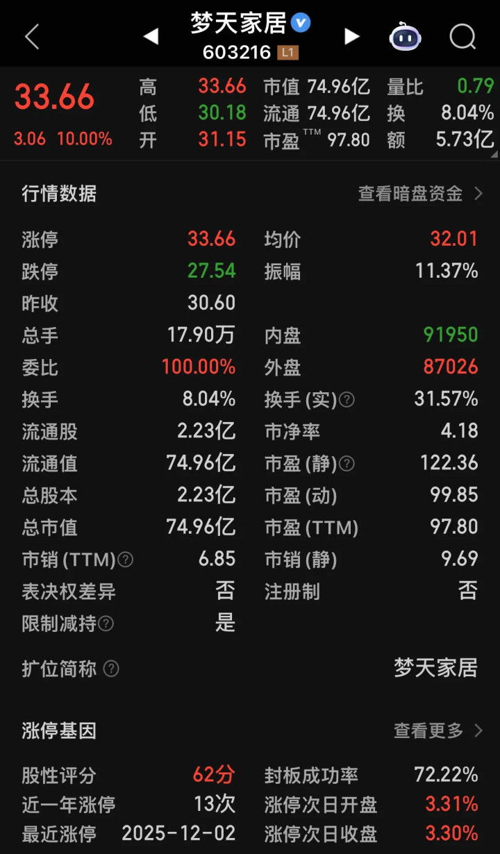 梦天家居10天7个板,累计暴涨超100%!上交所直接点名“严重异常波动”,公司吓得喊话:再乱涨我们就停牌自查!查了一圈股东和董秘,愣是说没发现未披露的重大信息。行吧,但凡股价敢喘口气,交易所的监管函比年报来得还勤快。